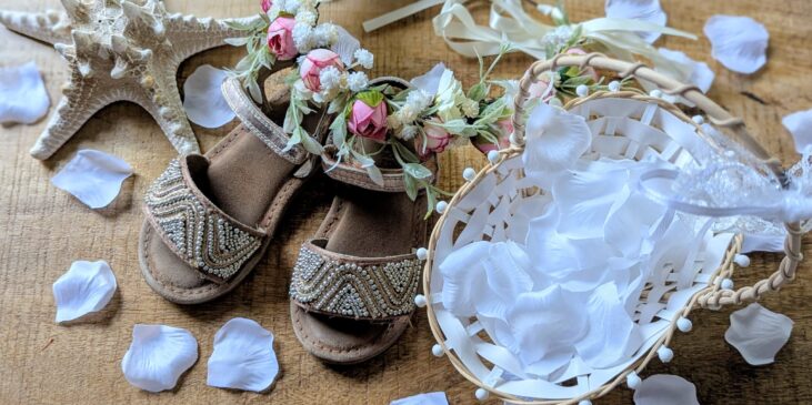 Das Erste, was ich kaufte, waren nicht etwa Brautschuhe oder Schmuck, sondern Kleider für unsere ganz persönlichen Blumenmädchen. Wochen vor der Hochzeit hatten die beiden Blumenkränze und goldene Sandalen – ich selbst immer noch keine Schuhe. Mit Kindern verschieben sich Prioritäten eben.